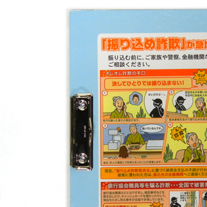 コメント:両面フルカラーオフセット印刷のクリップファイルで、金具は横付けになっています。